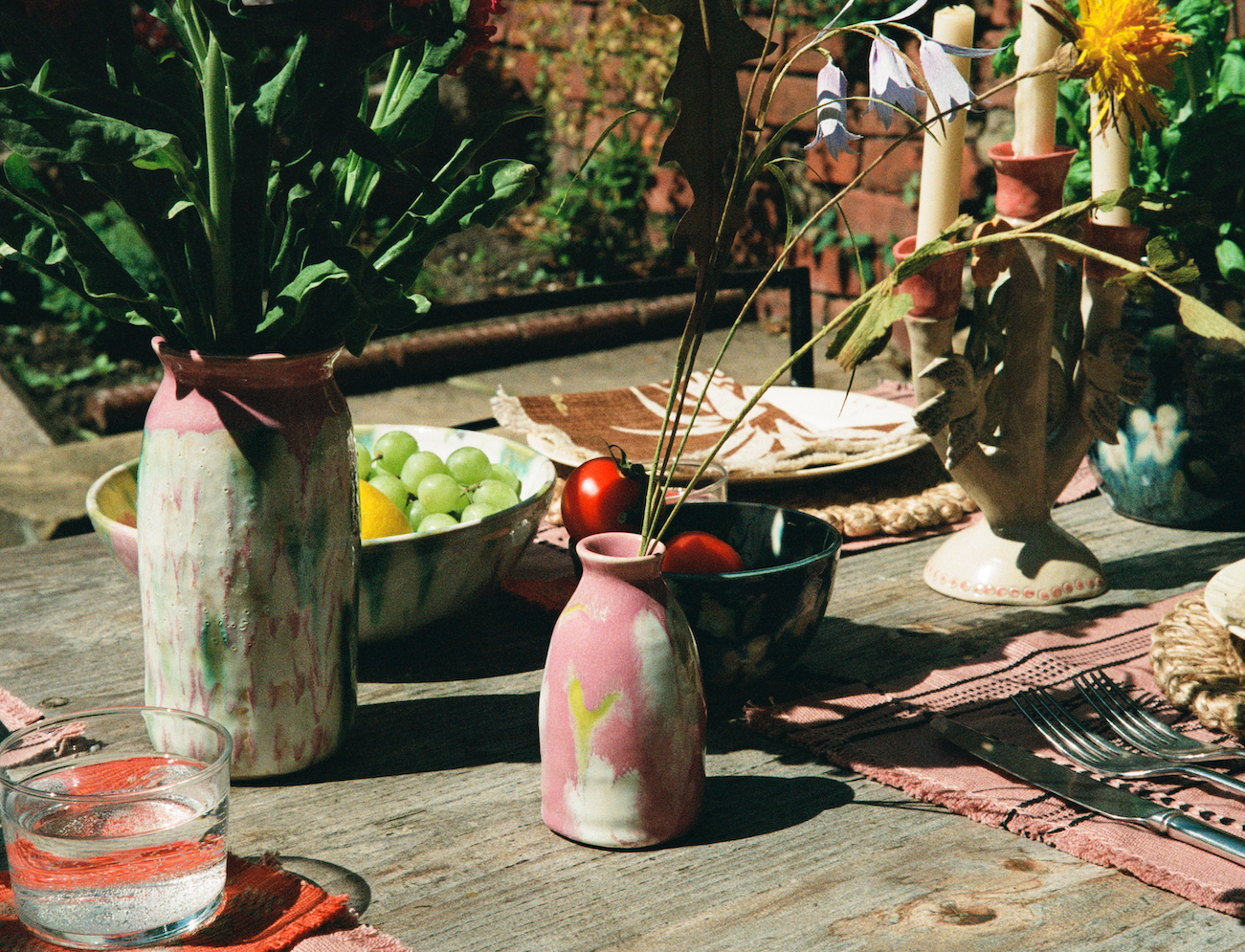 Kat creates playful, wheel-thrown pottery, designed to bring joy to everyday rituals and these bud vases are the perfect addition to your table or mantlepiece. Each piece Kat creates is thoughtfully crafted from white stoneware and hand-decorated. These bud vases come in two colour ways - storm honey flowers or pink honey flowers