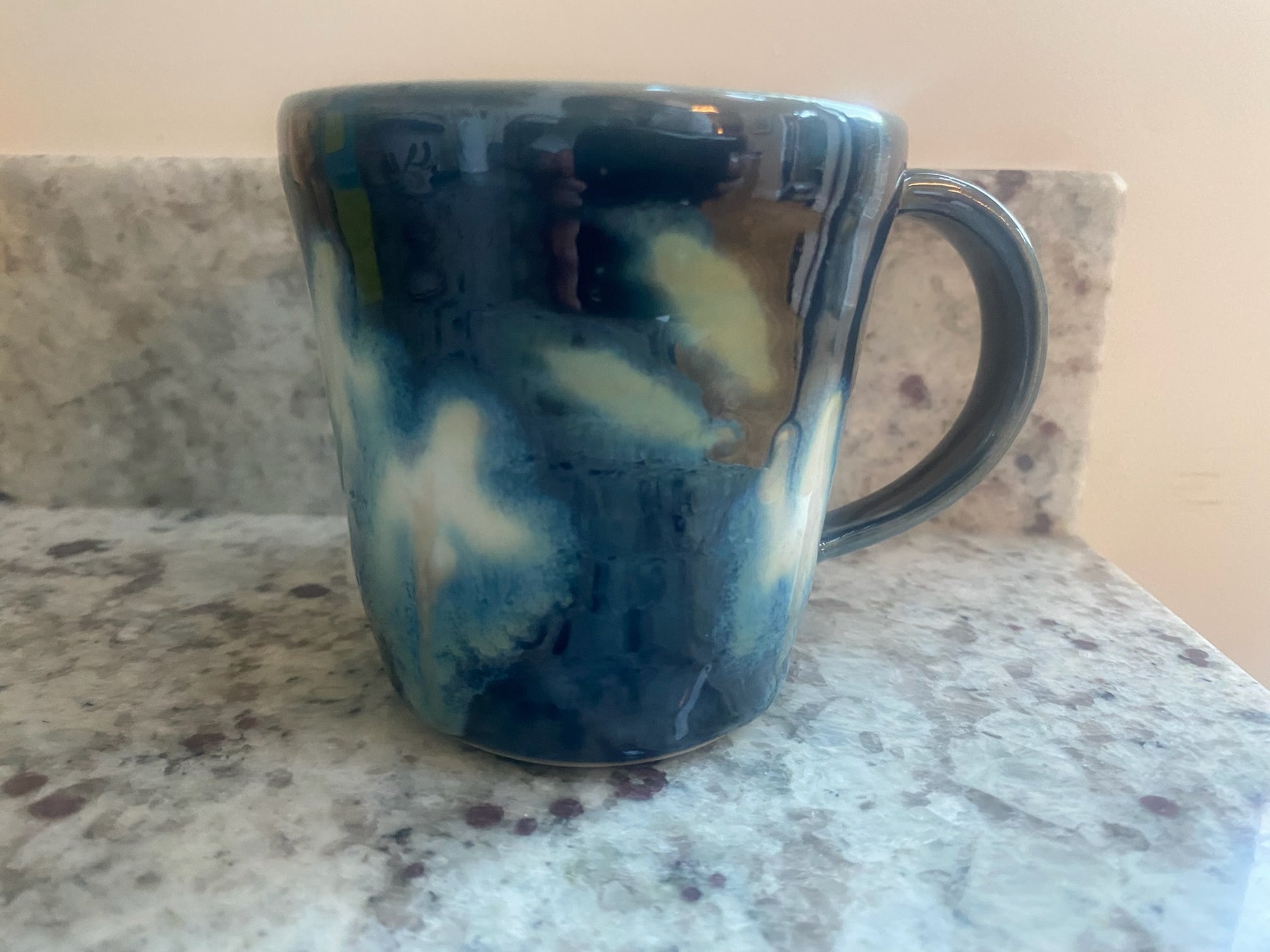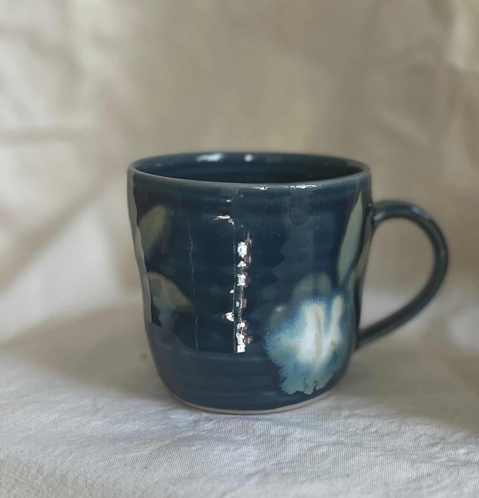 Kat creates playful, wheel-thrown pottery, designed to bring joy to everyday rituals and these mugs are the perfect way to enjoy your first cup of the day. Each piece Kat creates is thoughtfully crafted from white stoneware and hand-decorated. These mugs are glazed in storm blue and painted with cream honey flowers.