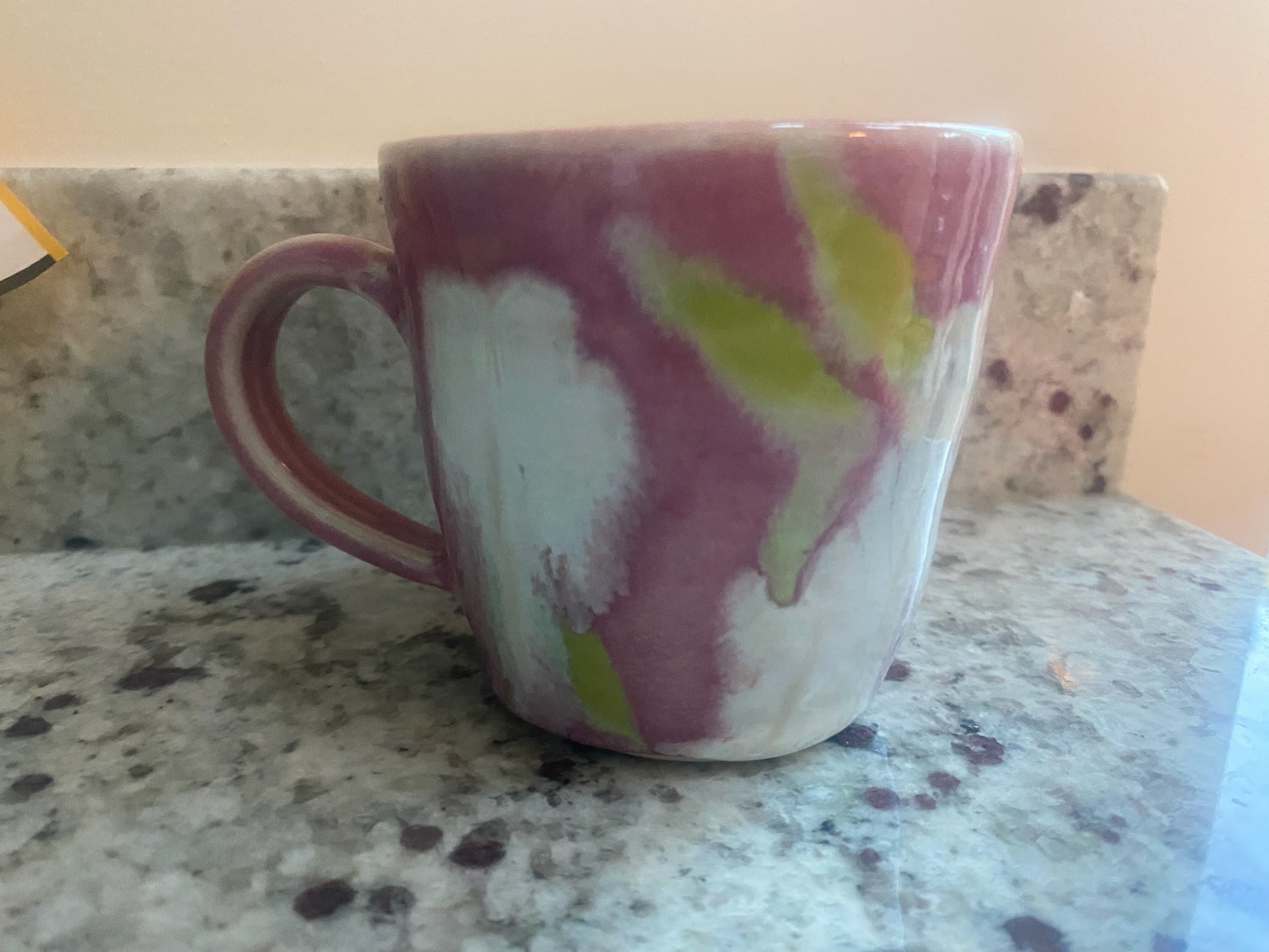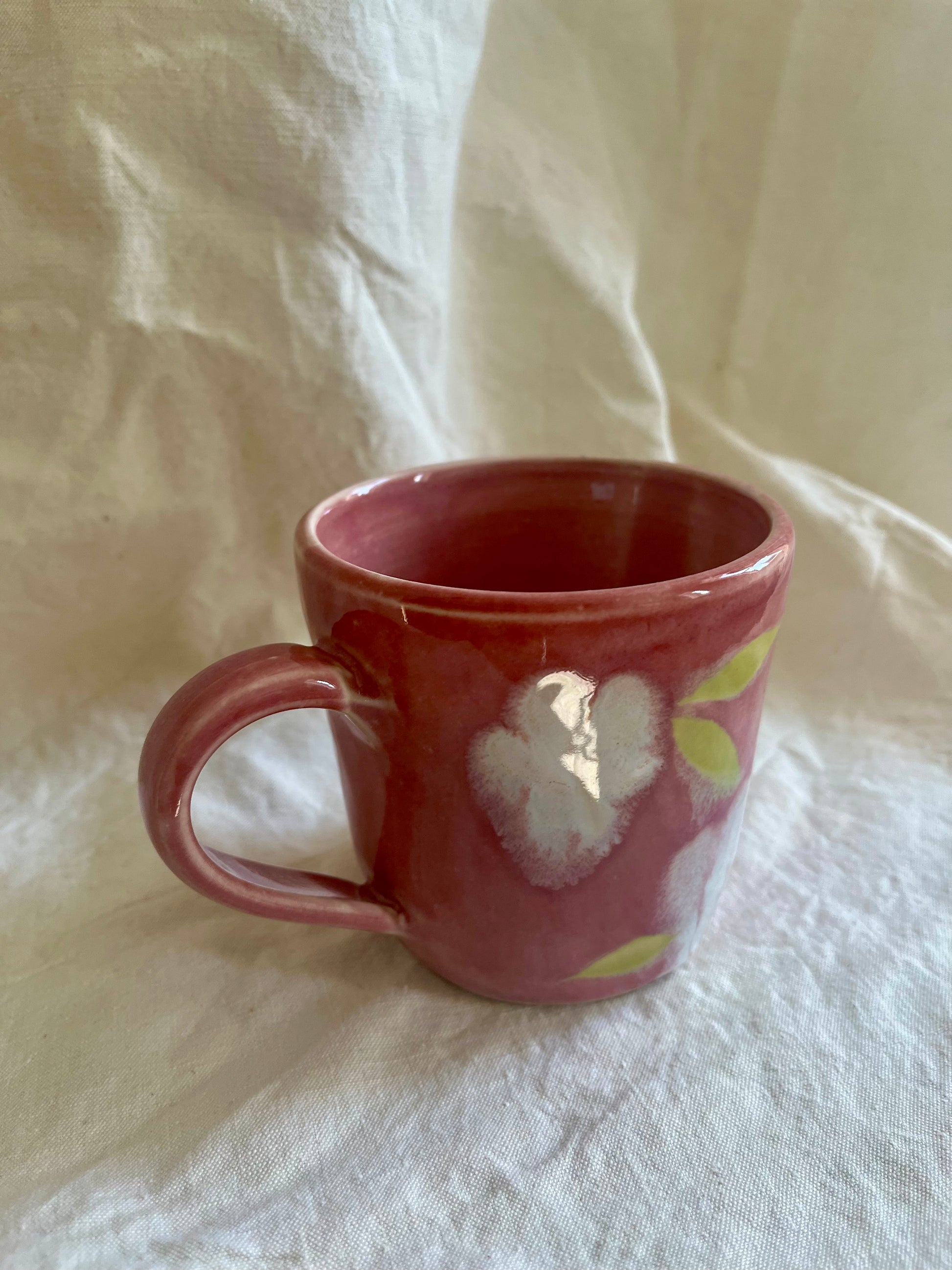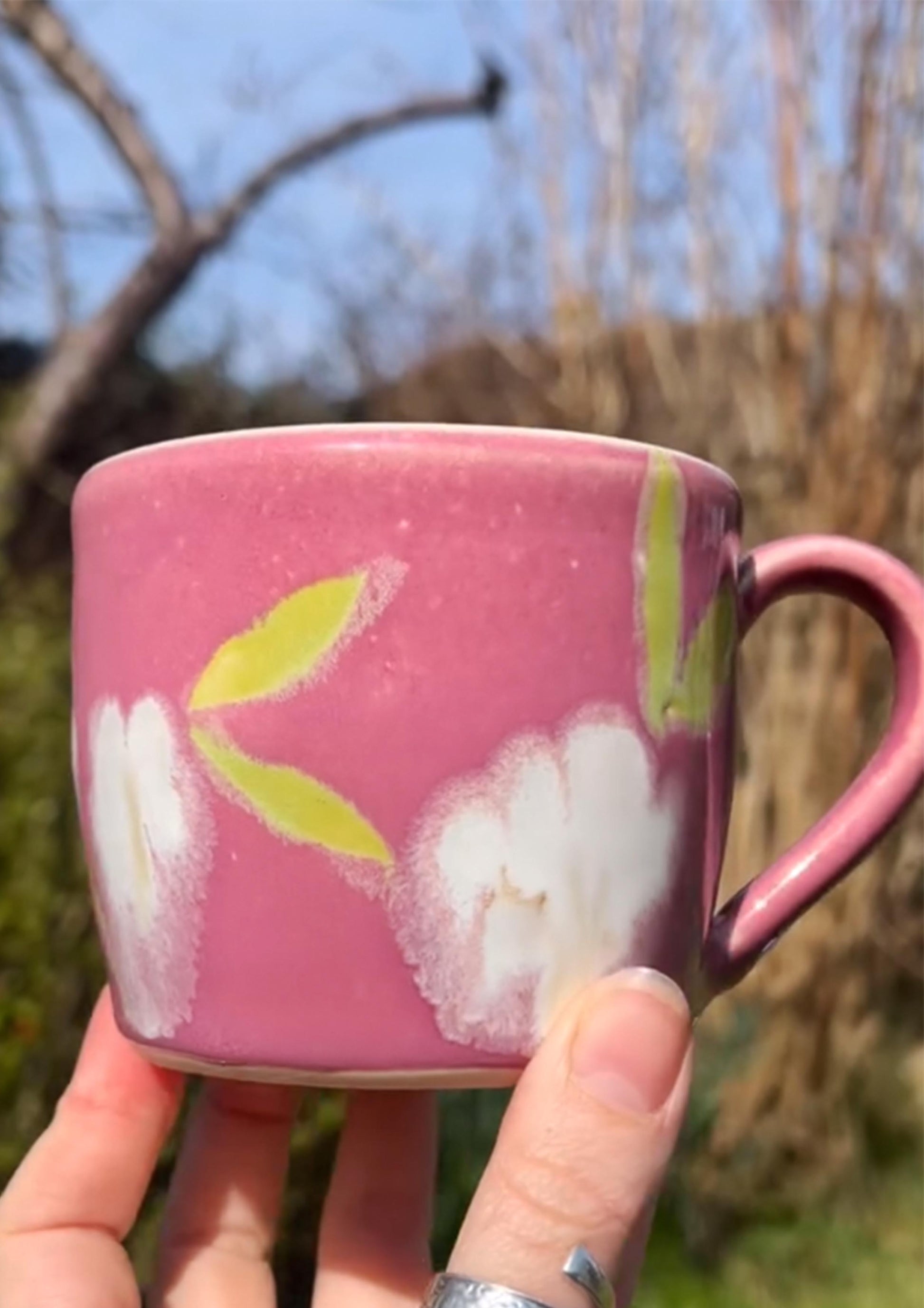 The Pink Flower Mug by Ceramics by Kat features a rich pink glaze accented with delicate hand-painted floral details in white, green, and subtle earthy tones. Its warm, organic shape and comfortable handle make it a cozy choice for your favourite hot beverage. No two mugs are alike, making each one a unique piece of functional art.