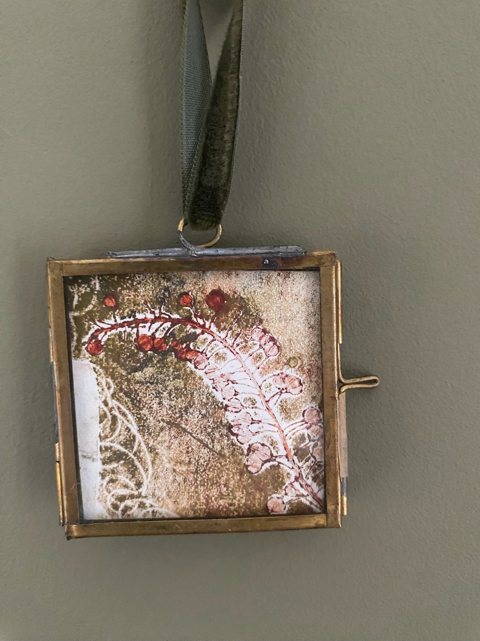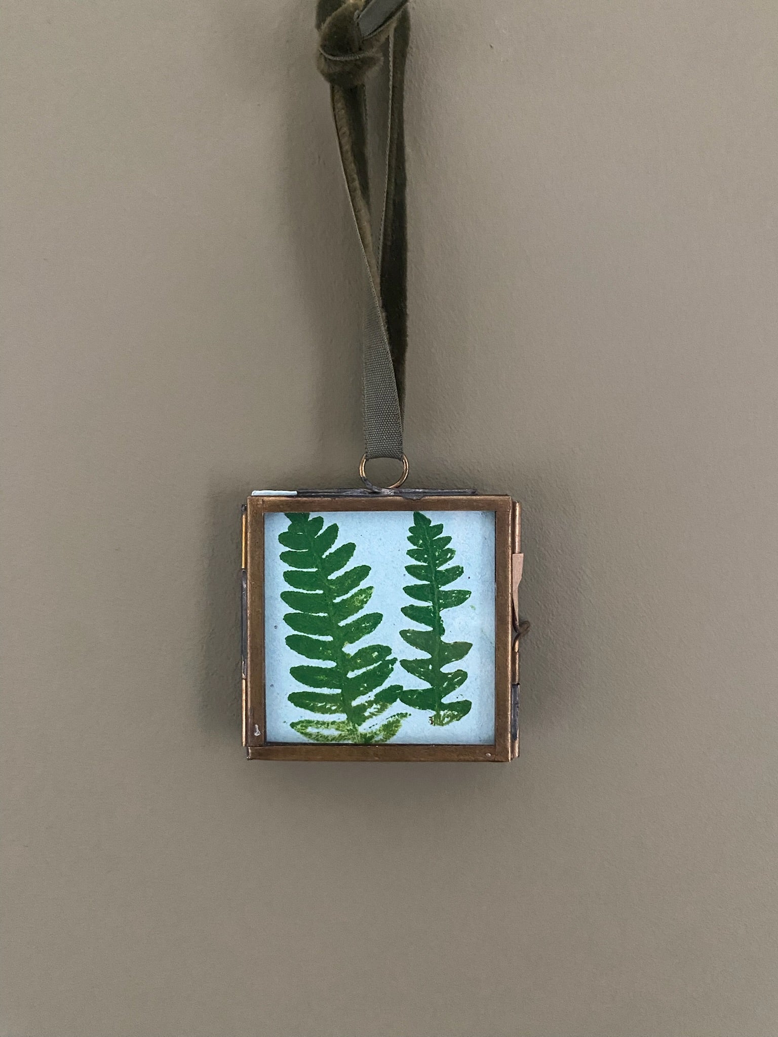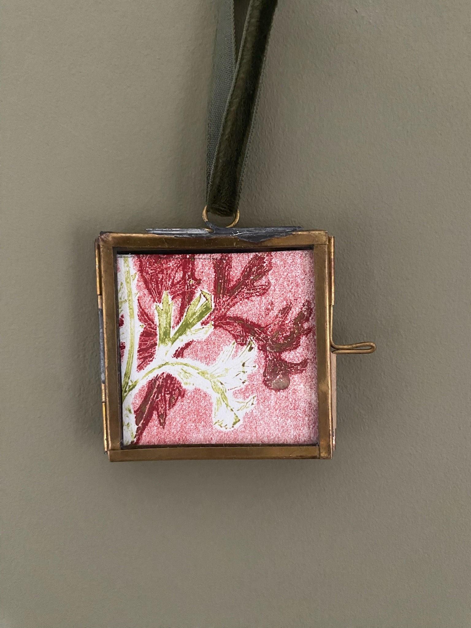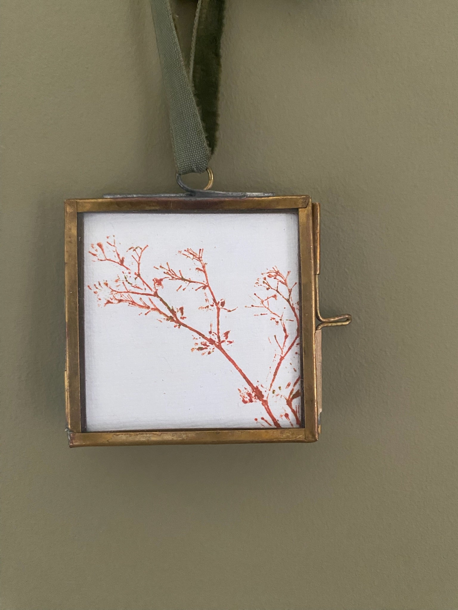 Mini lino seed prints in brass frames each hung with a green velvet ribbon. Unique tiny pieces of art work, perfect hung in groups or individually