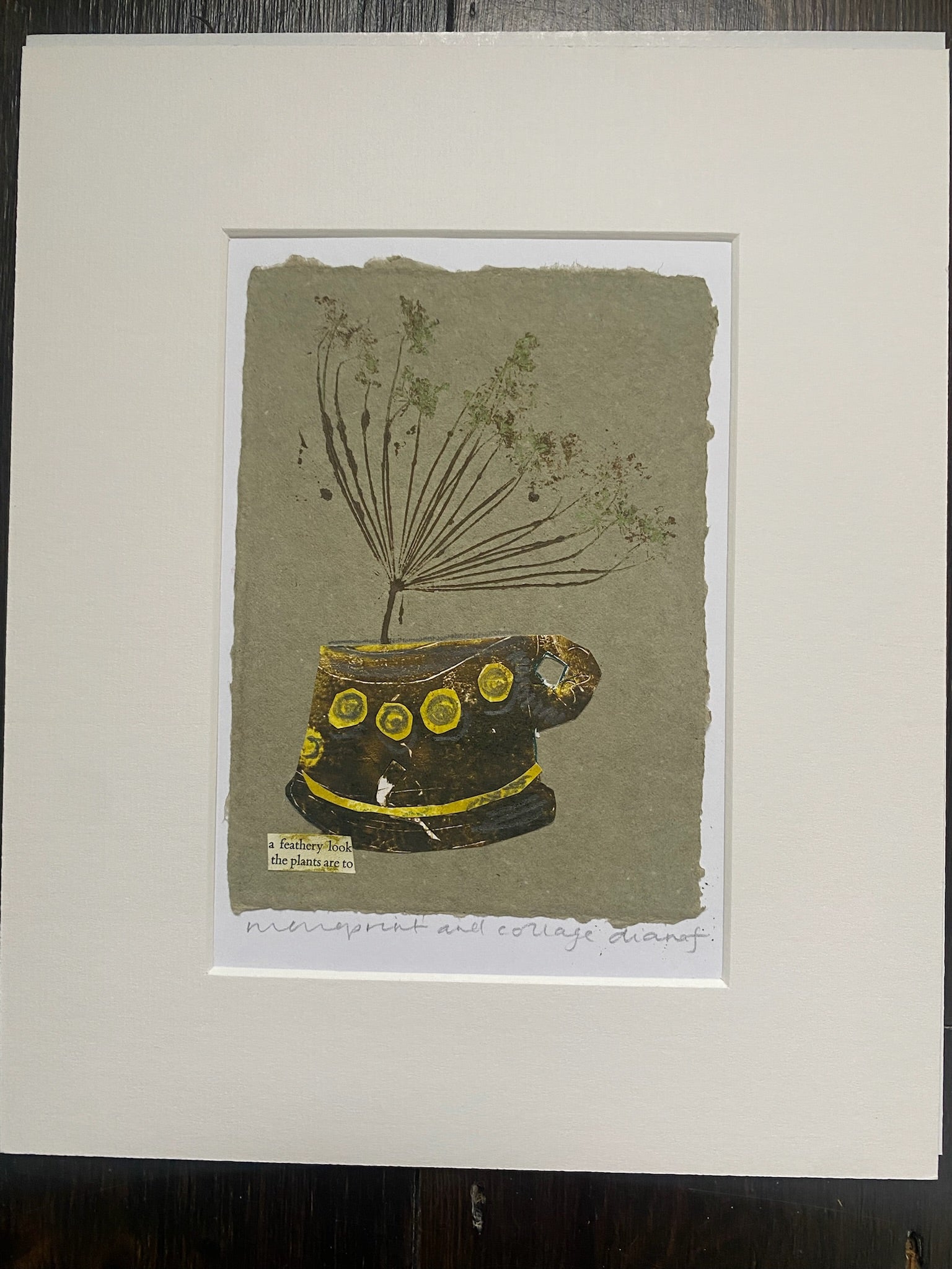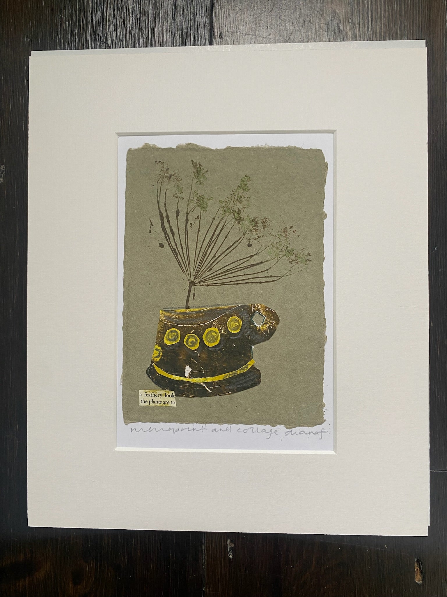 This original artwork by printmaker Diana Fitzpatrick features a graphic monoprinted cow parsley on olive handmade paper featuring a brown and yellow cup made of collaged printed offcuts. We love the additional print collage and use of colour on this one off artwork