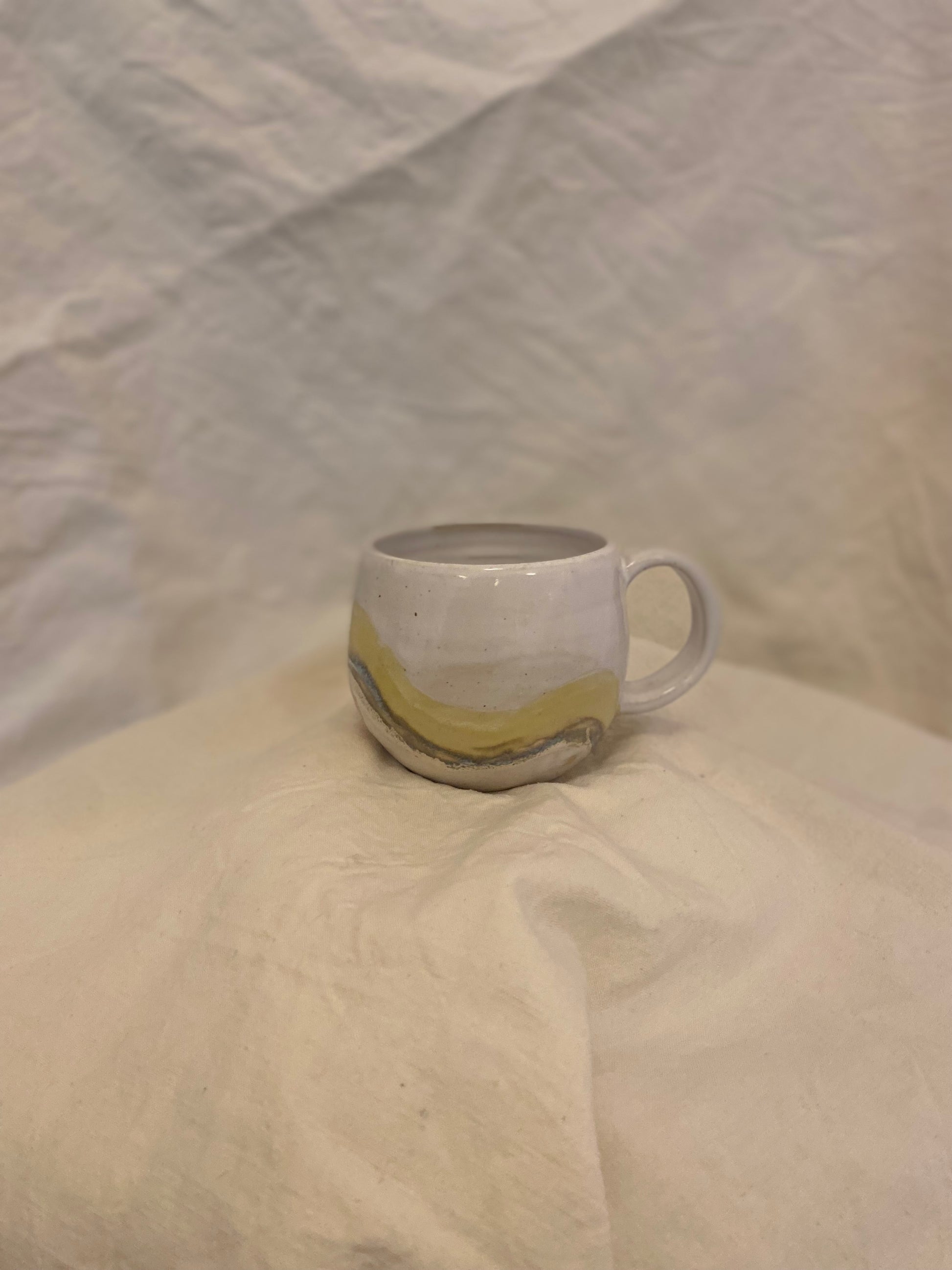 Medium mug in stoneware clay glazed in off-white with a pink spot and yellow and grey wave organic wash.
