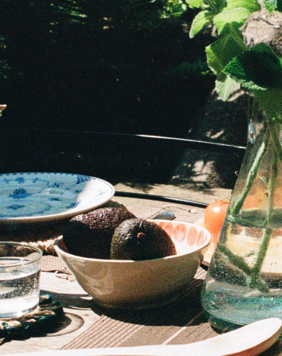 Medium stoneware bowl in a white glaze with various colours around the base and orange spots around the rim