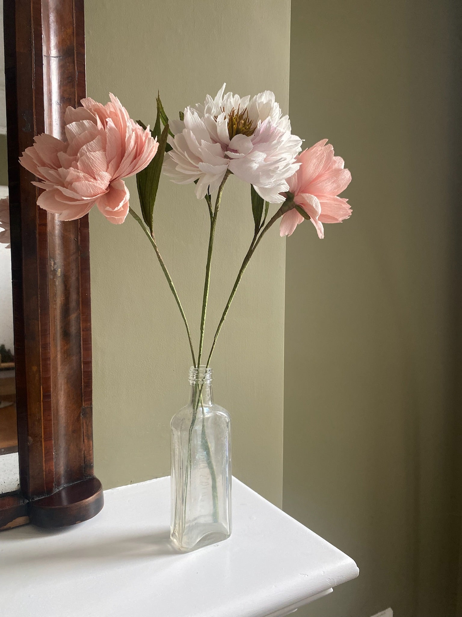 Folly & Bird's paper peony is a blowsy beauty - in full bloom, enjoy Spring in your house all year around. Designed by paper artist Fiona McKeown, they come in light pink or dark pink with a leaf on the stem. Buy as a single stem or as a bunch.